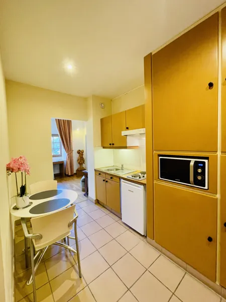Appartement tout équipé, avec un coin cuisine/repas, un coin chambre (1 lit double) un espace de travail, un coin salon, une salle de bain privative avec baignoire et le plus, l’accès à la tourelle surplombant le Lot !
